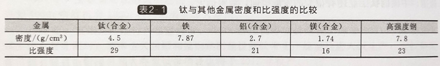 鈦的密度是4.51g/cm3,為鋼的 57%,鈦比鋁重不到兩倍,強度比鋁大三倍。鈦合金的比強度(強度/密度之比值)是常用工業合金中最大的(見表 2-1),鈦合金的比強度是不銹鋼的3.5倍;鋁合金的1.3倍;鎂合金的1.7倍,所以是宇航工業必不可少的結構材料。