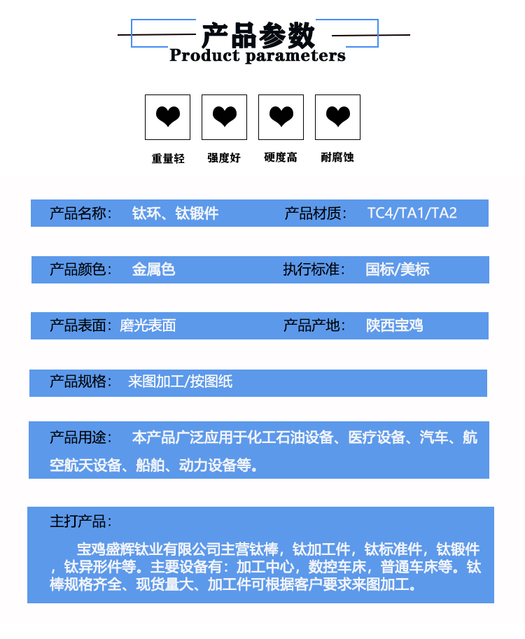 寶雞盛輝鈦業有限公司是一家主要從事鈦及鈦合金棒,鈦環,鈦法蘭及鈦合金板材的高新技術企業,公司提供鈦環,鈦合金棒批發,鈦環的生產工藝服務,以人為本,質量取勝為宗旨:18791863990,18740375975