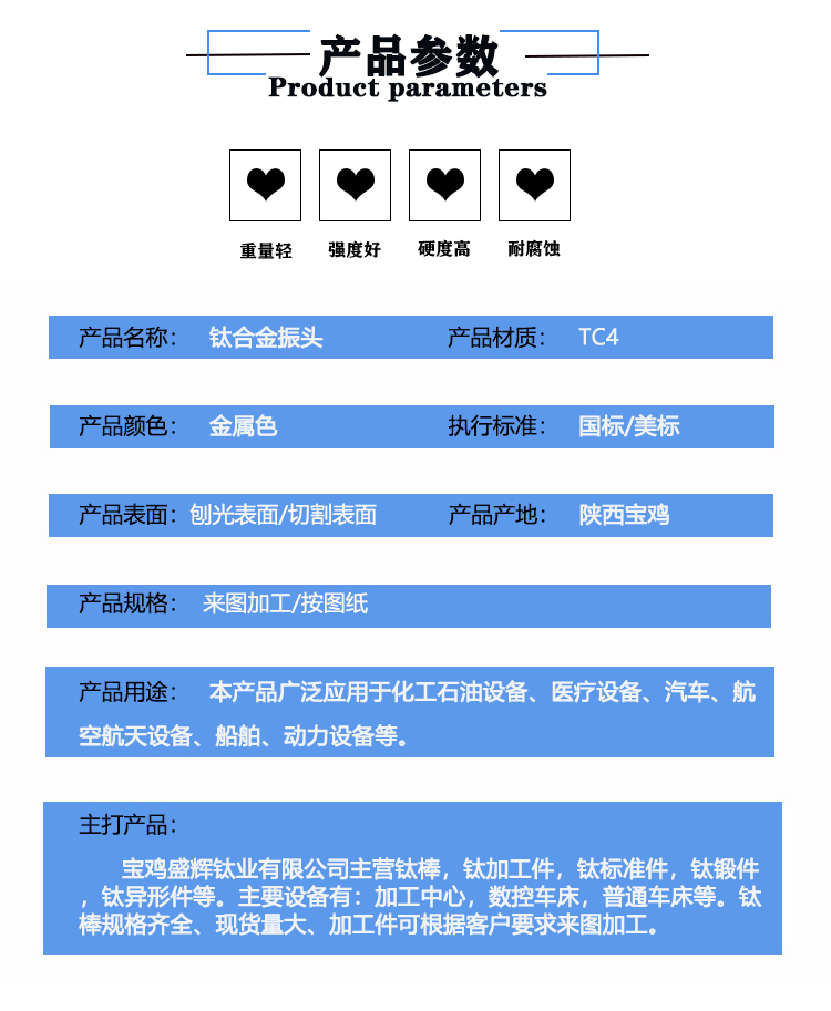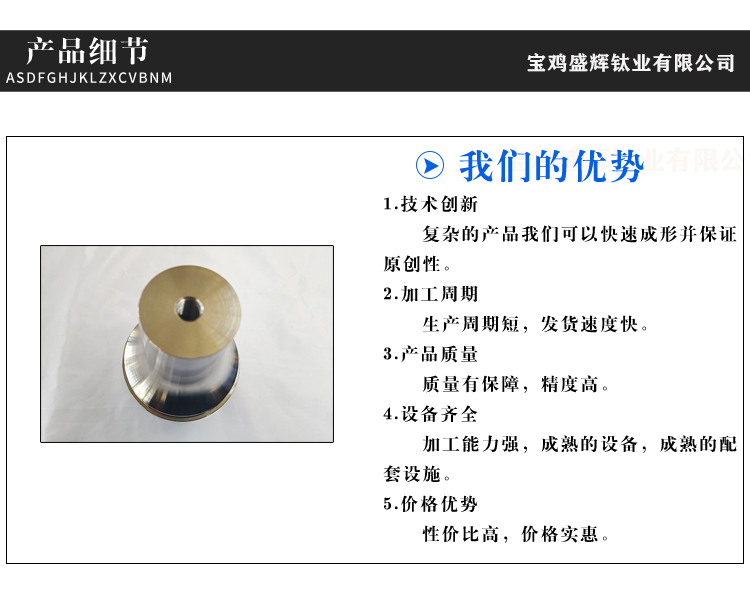 寶雞盛輝鈦業(yè)有限公司是一家主要從事鈦及鈦合金棒,鈦環(huán),鈦法蘭及鈦合金板材的高新技術企業(yè),公司提供鈦環(huán),鈦合金棒批發(fā),鈦環(huán)的生產工藝服務,以人為本,質量取勝為宗旨:18791863990,18740375975
