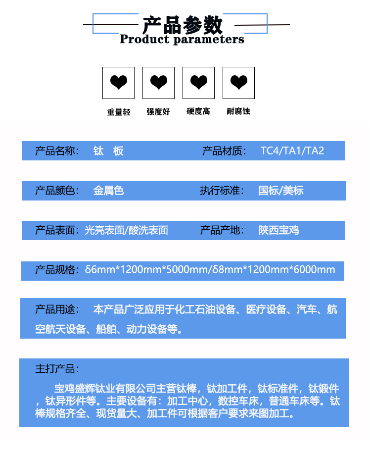 寶雞盛輝鈦業有限公司是一家主要從事鈦及鈦合金棒,鈦環,鈦法蘭及鈦合金板材的高新技術企業,公司提供鈦環,鈦合金棒批發,鈦環的生產工藝服務,以人為本,質量取勝為宗旨:18791863990,18740375975