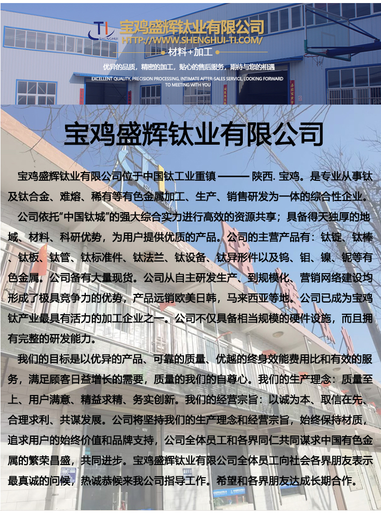 寶雞盛輝鈦業有限公司是一家主要從事鈦及鈦合金棒,鈦環,鈦法蘭及鈦合金板材的高新技術企業,公司提供鈦環,鈦合金棒批發,鈦環的生產工藝服務,以人為本,質量取勝為宗旨:18791863990,18740375975